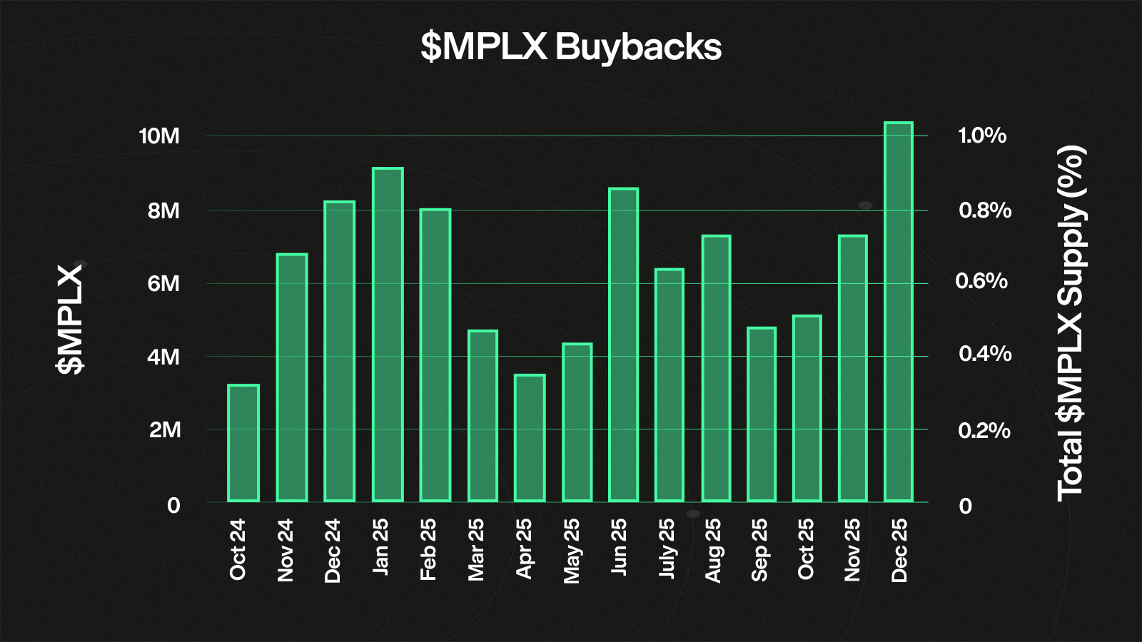 December recorded the highest $MPLX buyback month ever as $0.5M of November’s protocol revenue was used to buy back 10.3M $MPLX for the DAO (1.0% of total supply / 1.8% of outstanding supply). Each month, 50% of prior month’s protocol revenue is allocated to $MPLX buybacks for the DAO.
